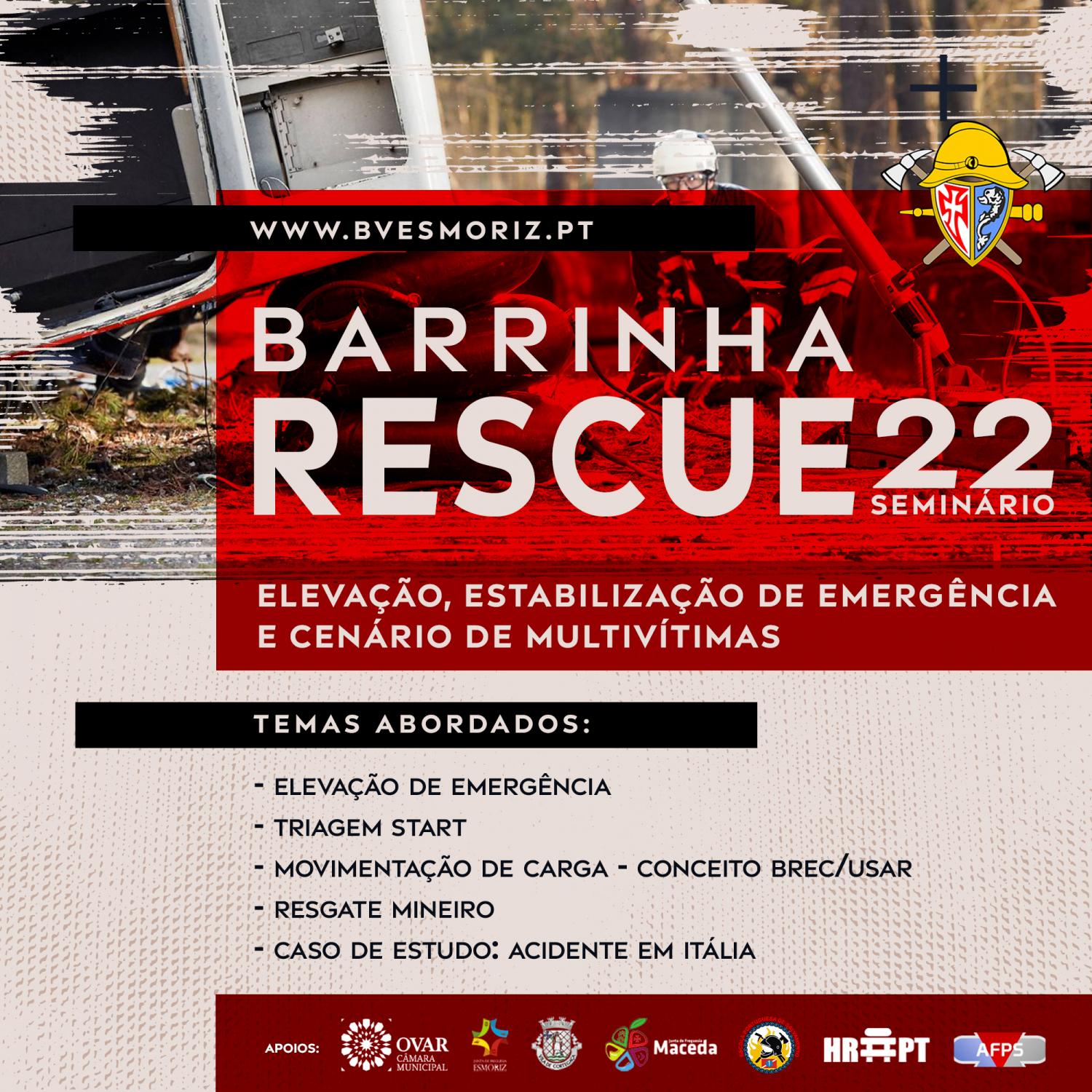 No dia 14 de Maio, os Bombeiros Voluntários de Esmoriz irão realizar o Barrinha Rescue22. Um seminário cujos temas principais são elevação, estabilização de emergência e cenário multivitimas, que decorrerá entre as 8H e as 18H, com pausa para almoço.